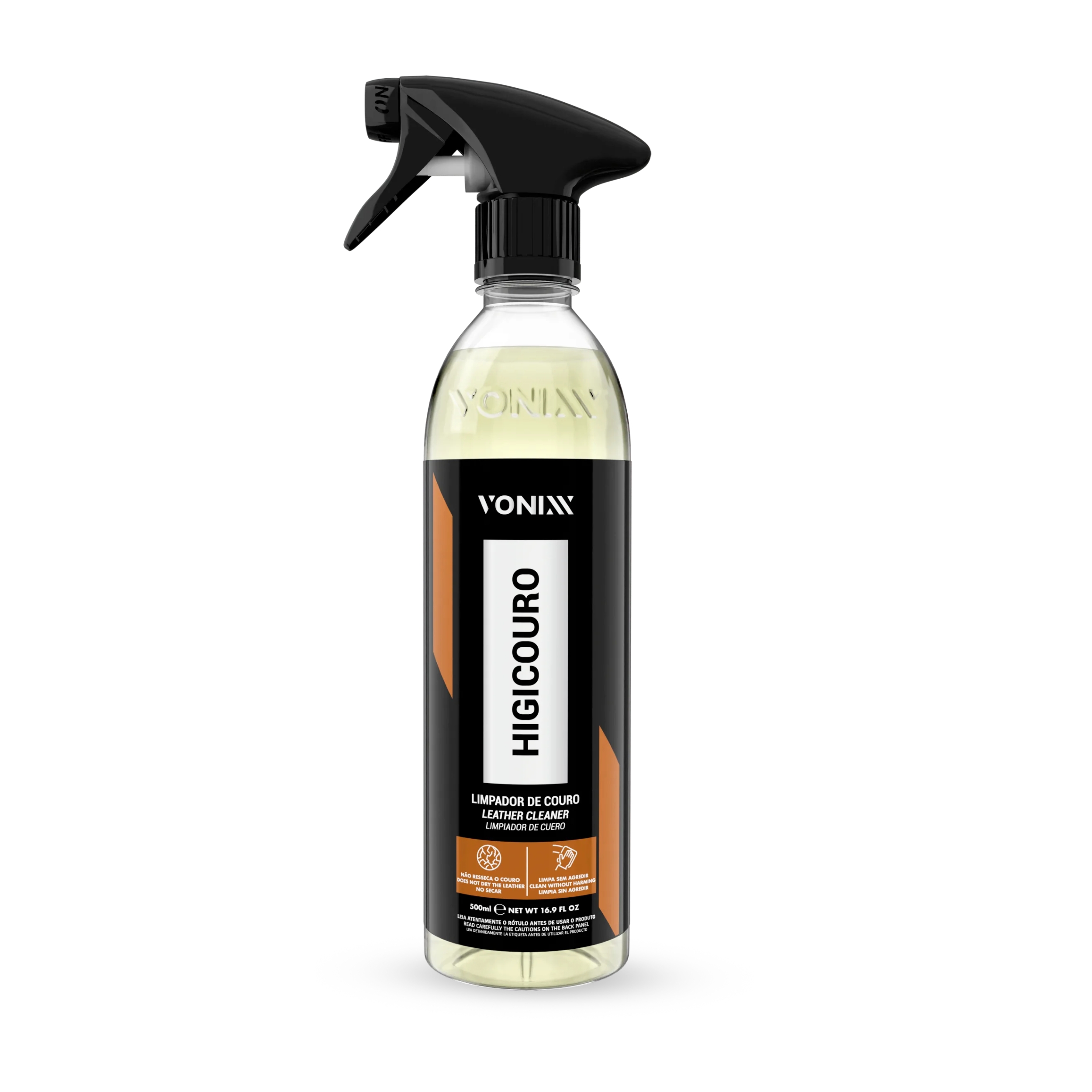 HIGICOURO VONIXX, vai promover uma limpeza segura, sem riscos de remoção de pigmentos do couro por uso de produtos agressivos.